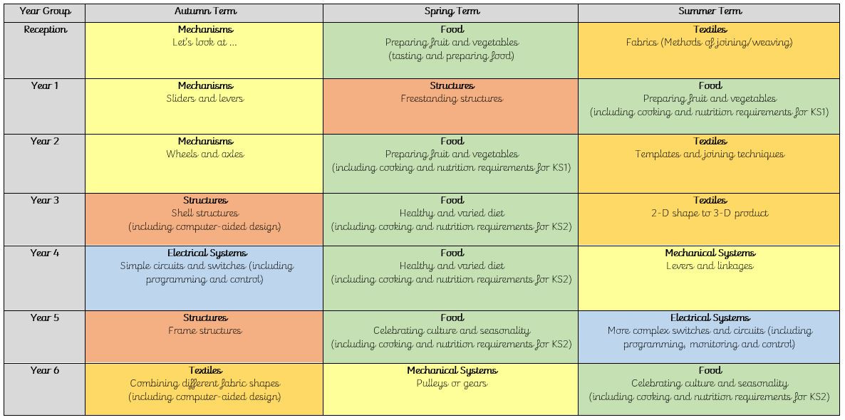 Design and Technology is taught as a skill-based subject that is linked to the wider curriculum. Lessons delivered to each year group focus on 3 topics and a separate set of skills throughout the year. Each half term, Design and Technology and Art alternate; projects are delivered as either a block of work or over a series of lessons or consecutive weeks. The time dedicated to Design and Technology ensures that each topic can be delivered to a high standard and children can create products with a purpose.