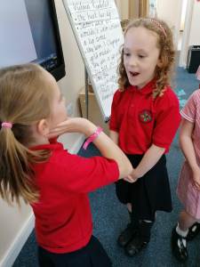 Children are encouraged and supported to develop their speaking and listening skills through conversational work, singing activities and games. They learn to speak with increasing fluency, spontaneity and find ways of communicating what they want to say, including through discussion and asking questions. As confidence and skills grow, children record their work through pictures, captions and sentences.