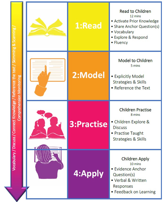 Reading lessons follow a rigorous, research-informed lesson design to ensure there is a balance between teacher-led instruction, children practicing, and independent application.