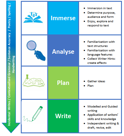 Children follow clear, sequential episodes of learning based around an ambitious model text, that allow for the development of vocabulary and contextualised spelling, punctuation, and grammar. Units start by engaging children in a variety of reading activities, so that they fully understand the text and are able to ‘read as a writer’. Reading as a writer is a key component out our approach and involves children analysing the model text to understand the techniques the author has used and the subsequent effect on the reader. Throughout the writing process, the teacher models writing and undertakes shared writing and guided writing to develop the children’s knowledge and skills, in readiness for independent writing. By providing children with a range of writing opportunities, they are given the chance to draw on their reading and to adapt their language and style for a range of contexts, purposes, and audiences.